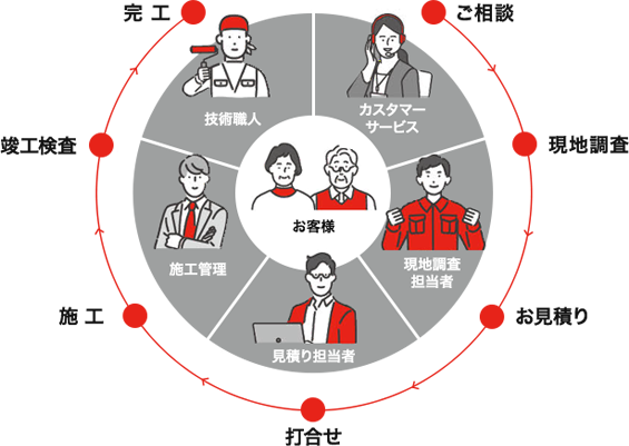 仕事のご依頼を受け、プランニングし、施工が完成するまで私たちは一貫体制で管理しています。途中での工事の追加や変更のご依頼があった場合でも、柔軟に対応できる体制と、アフターサービスに至るまでの一貫体制があるからこそお客様からの信頼が生まれ、長期のお付き合いをさせていただくことができると当社は信じています。