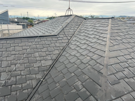 スレート屋根やセメント系の屋根材では、色あせやコケ、カビが出ていることがあります。これは塗膜の防水性が低下しているサインのひとつです。