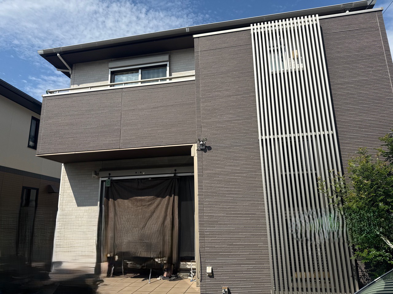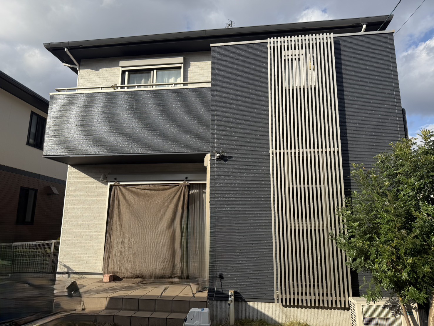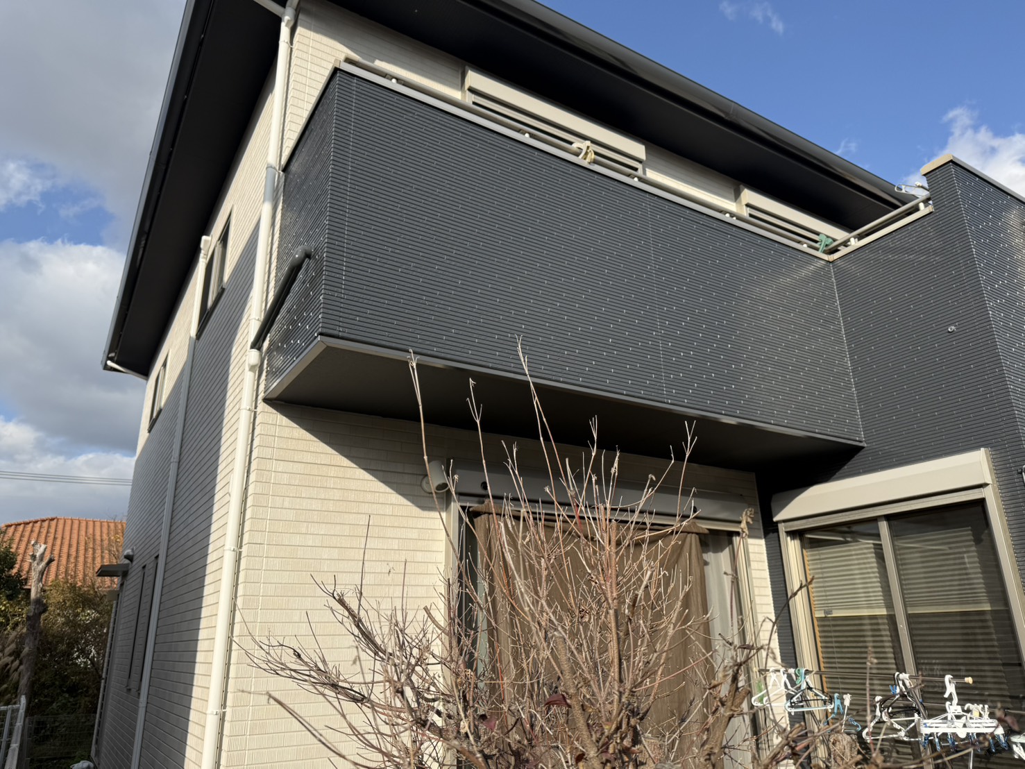 そこで今回は、屋根・外壁ともに下地処理から丁寧に行い、塗装の持ちを高める施工内容をご提案。外壁と屋根を同時にメンテナンスすることで、建物全体の保護性能を高め、将来的な劣化リスクを抑える計画としました。色選びでは、I様こだわりのモノトーンデザインを崩さないよう、濃色と淡色のバランスを重視。立体感や陰影がより際立つ配色を意識しています。下地処理から仕上げまで、建物の状態に合わせて丁寧に施工しました。外観の雰囲気を大切にしつつ、耐久性も高めることを目的とした塗装工事です。