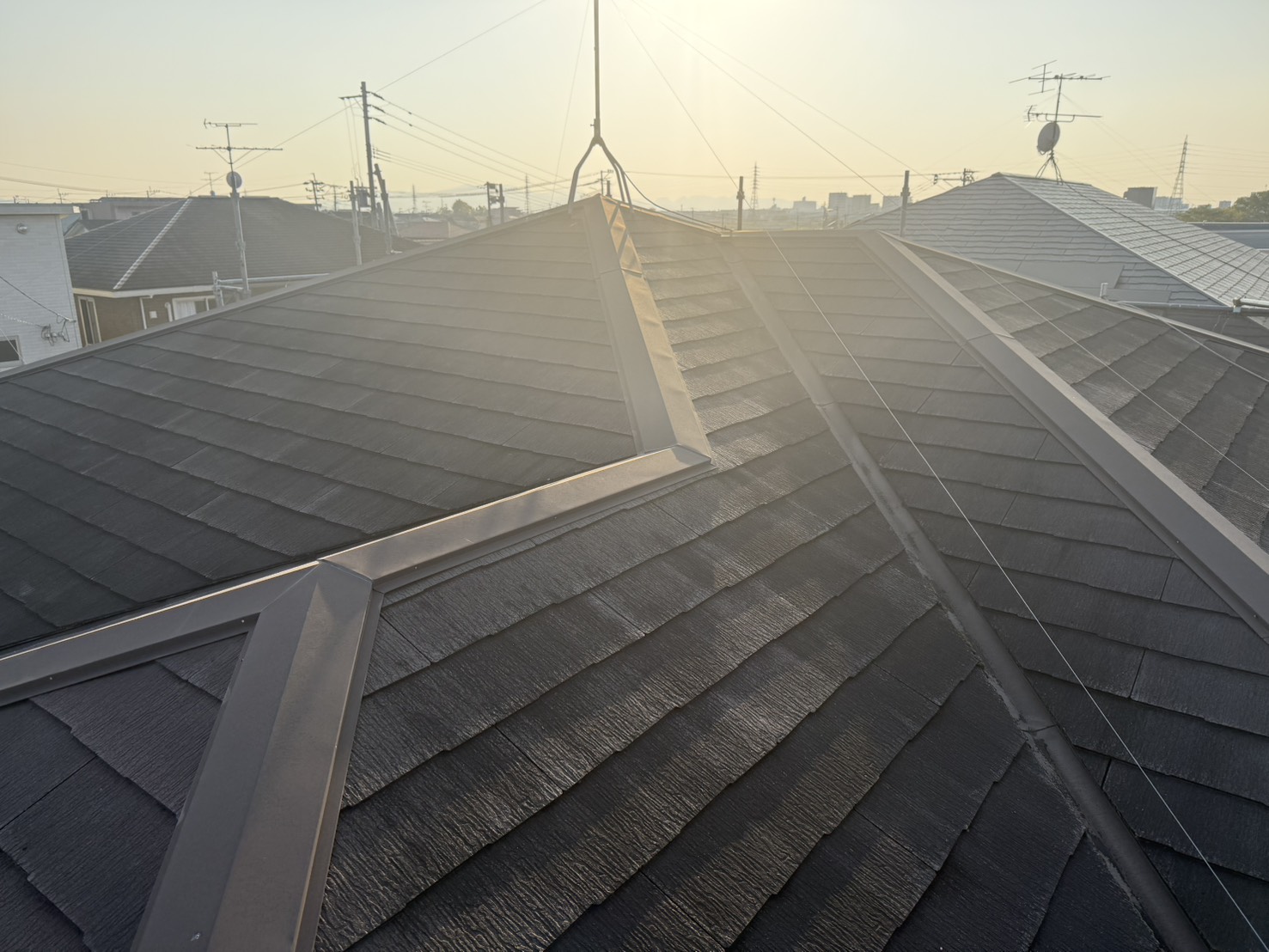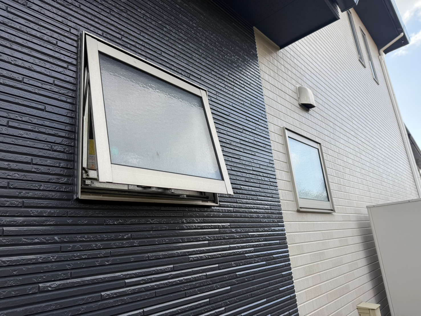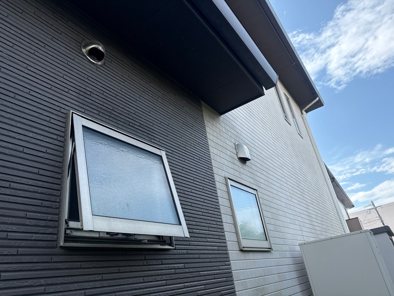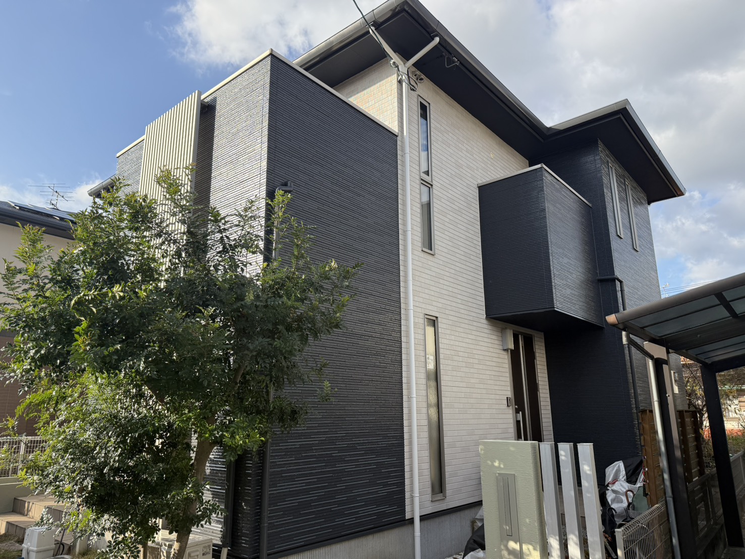施工後は外壁全体にツヤが戻り、建物のシャープなラインがより美しく引き立っているのが分かります。濃い色の外壁部分は重厚感を演出し、明るい色とのコントラストによってスタイリッシュな印象に。屋根や外壁が均一に仕上がったことで、家全体に統一感が生まれ、新築のような清潔感も感じられる外観へと生まれ変わりました。細部まで丁寧に仕上げることで、写真からも質感の違いが伝わります。