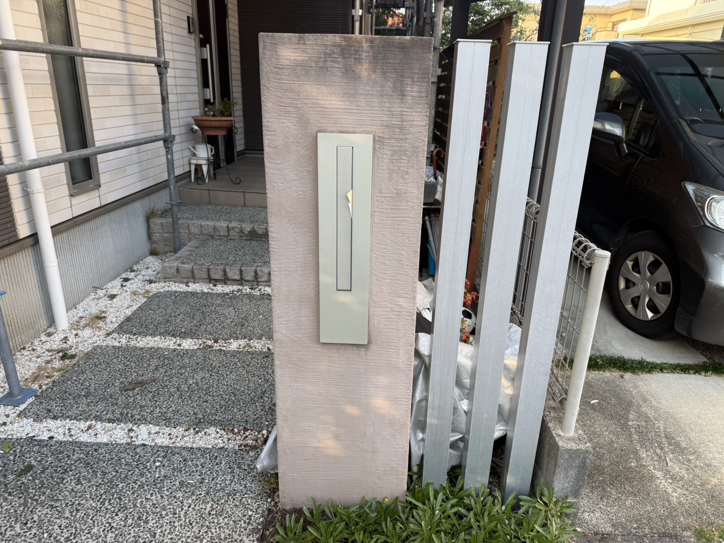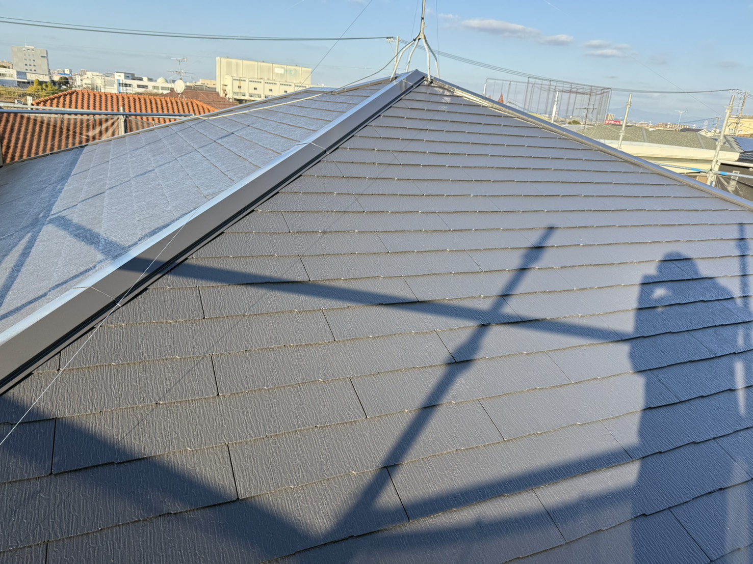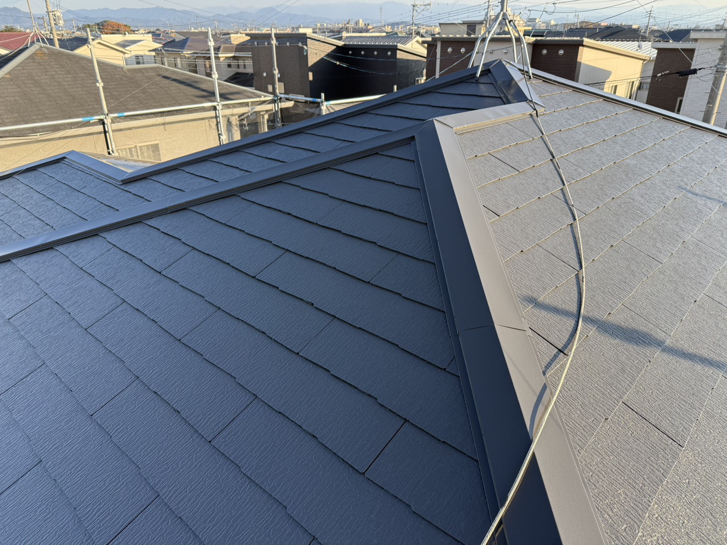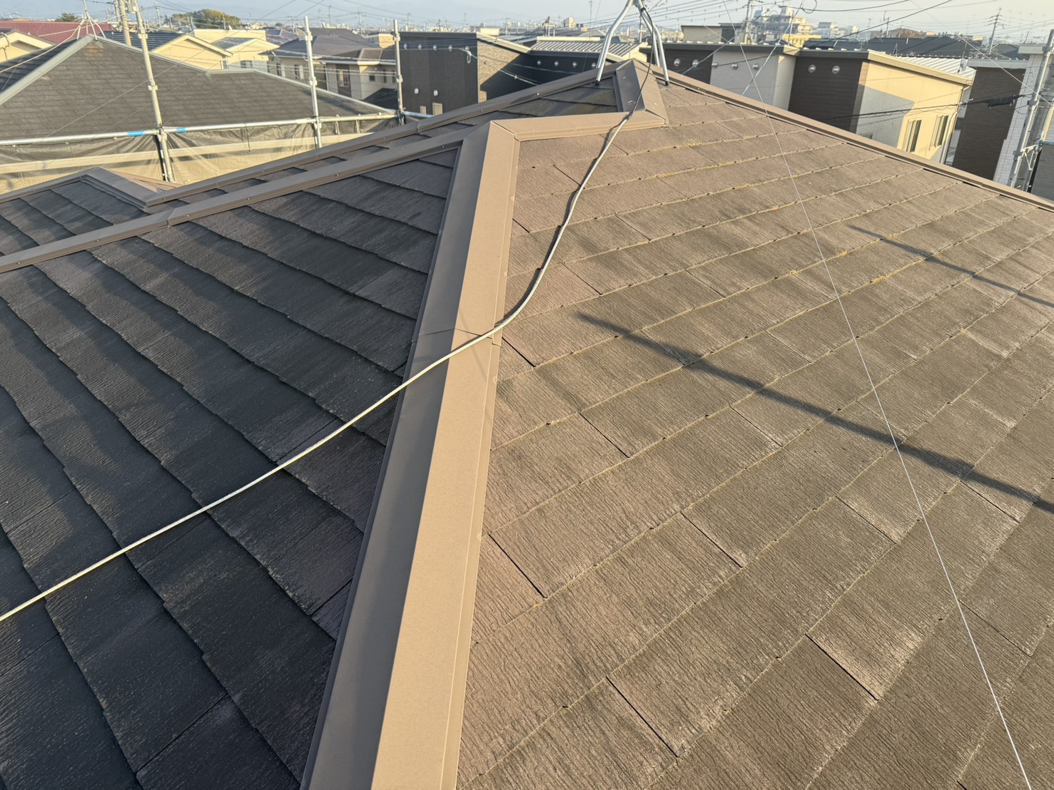 施工後は外壁全体にツヤが戻り、建物のシャープなラインがより美しく引き立っているのが分かります。濃い色の外壁部分は重厚感を演出し、明るい色とのコントラストによってスタイリッシュな印象に。屋根や外壁が均一に仕上がったことで、家全体に統一感が生まれ、新築のような清潔感も感じられる外観へと生まれ変わりました。細部まで丁寧に仕上げることで、写真からも質感の違いが伝わります。