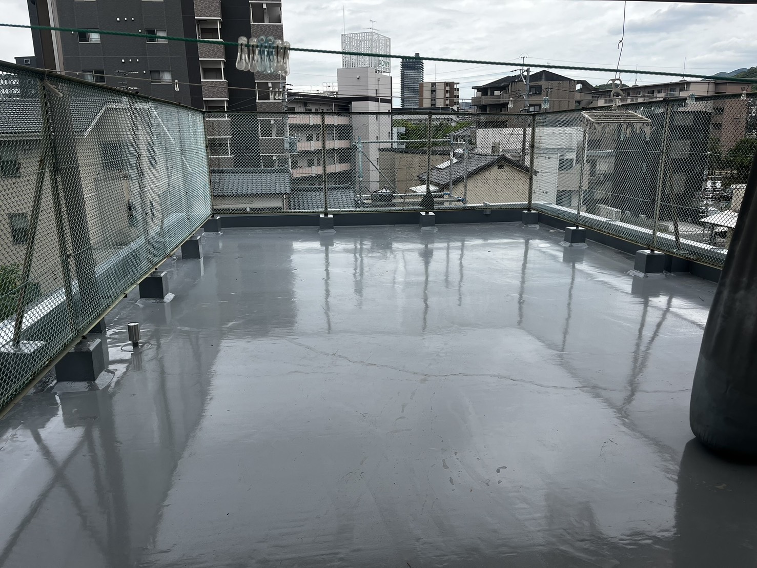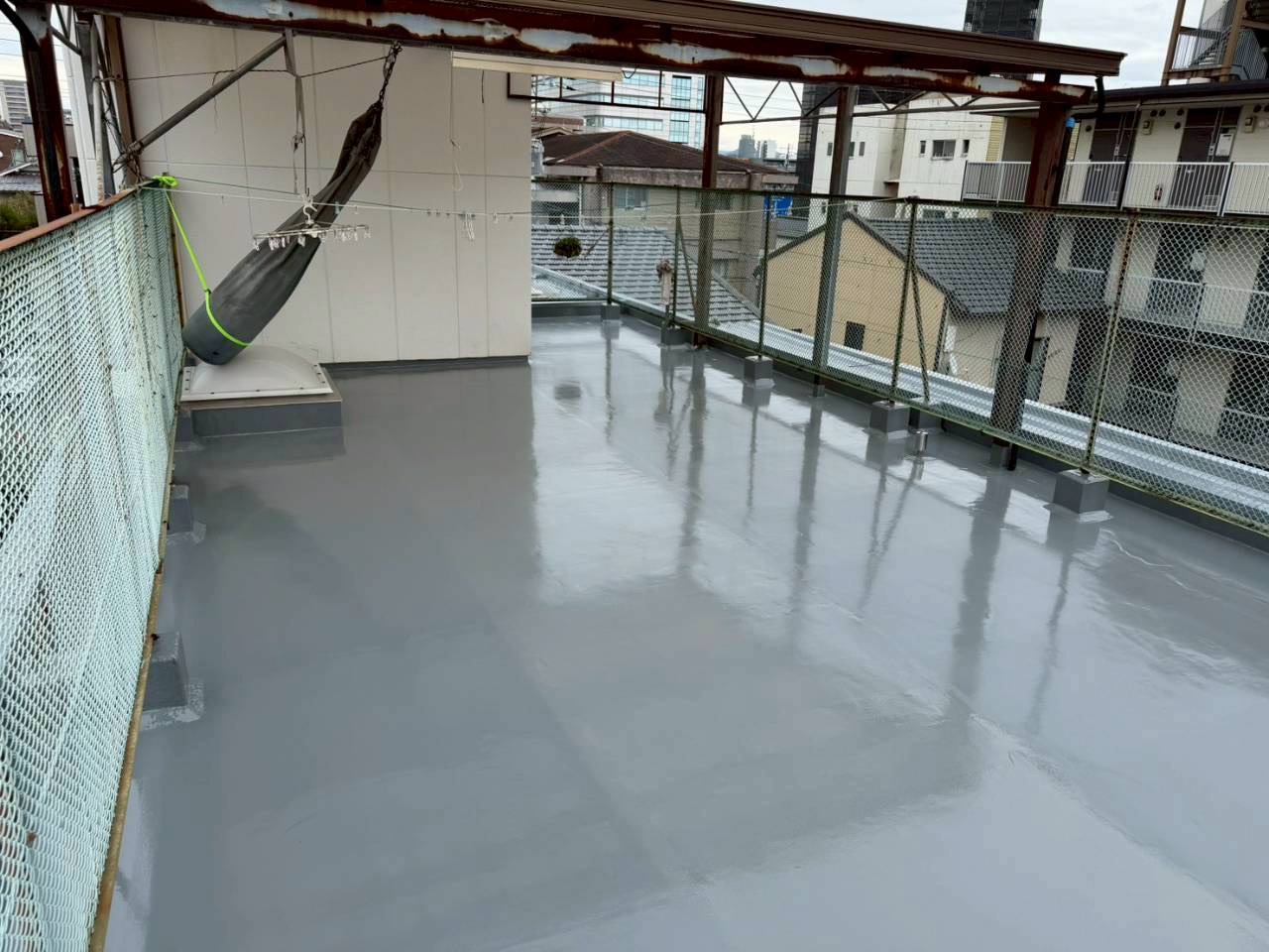 施工後の写真では、防水層がきれいに仕上がり、光沢のある滑らかな表面になっています。